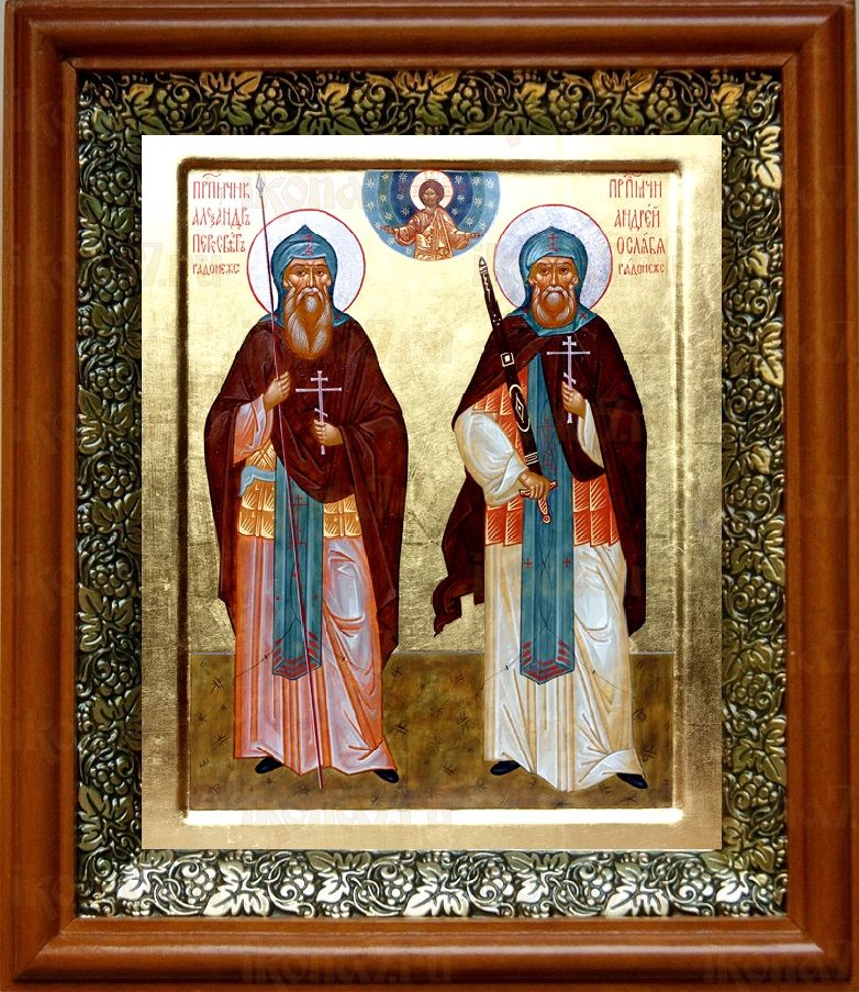 Икона Александр Пересвет и Андрей Ослябя в киоте с басмой Виноградная Лоза (UV-печать)(30034)