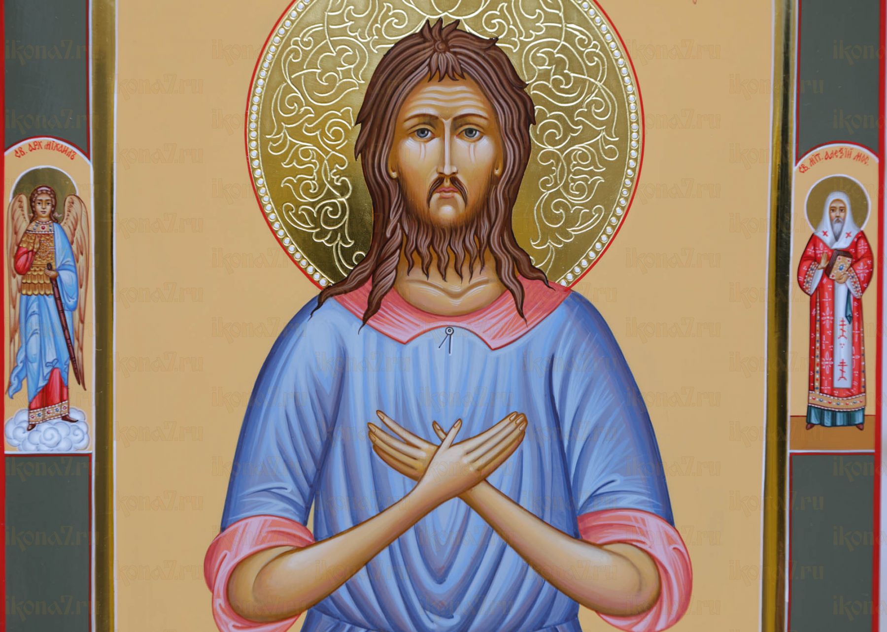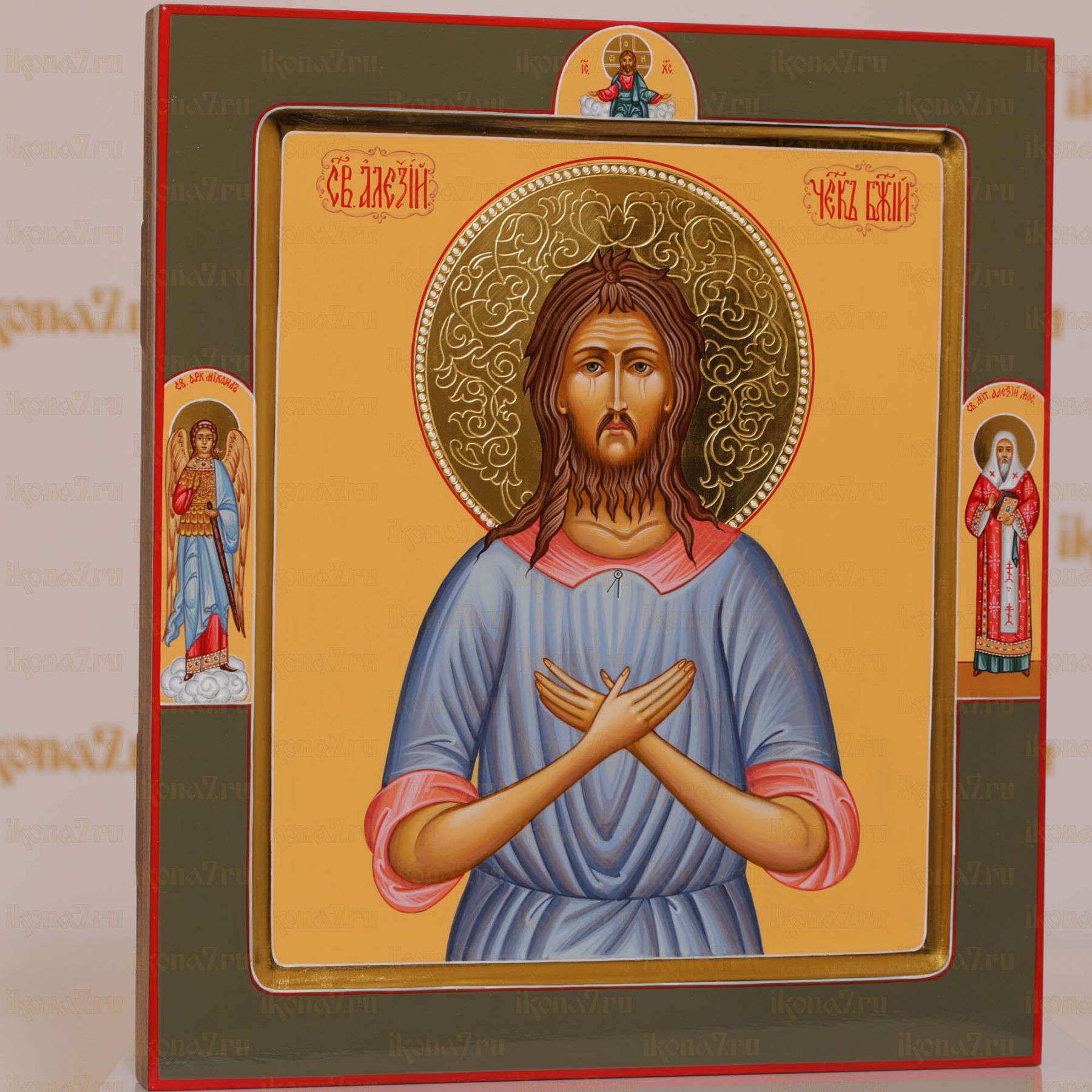 В наличии рукописная икона с ковчегом Алексий Человек Божий 27х31 см с предстоящими на полях Митрополит Алексий Московский и Архангел Михаил (с сусальными золотом , пробивкой и чеканкой по нимбу).