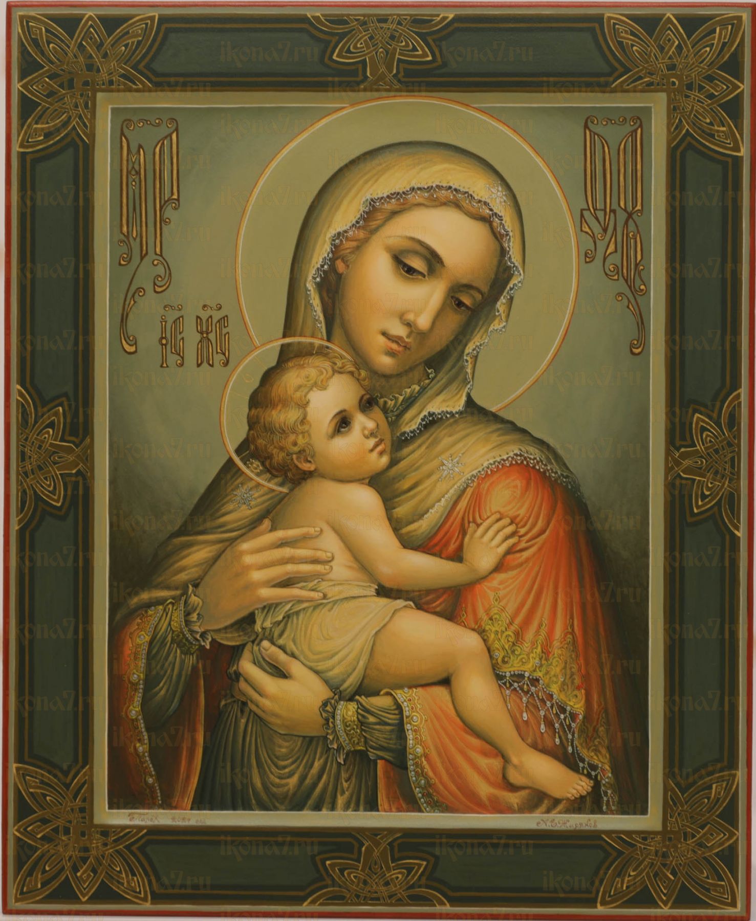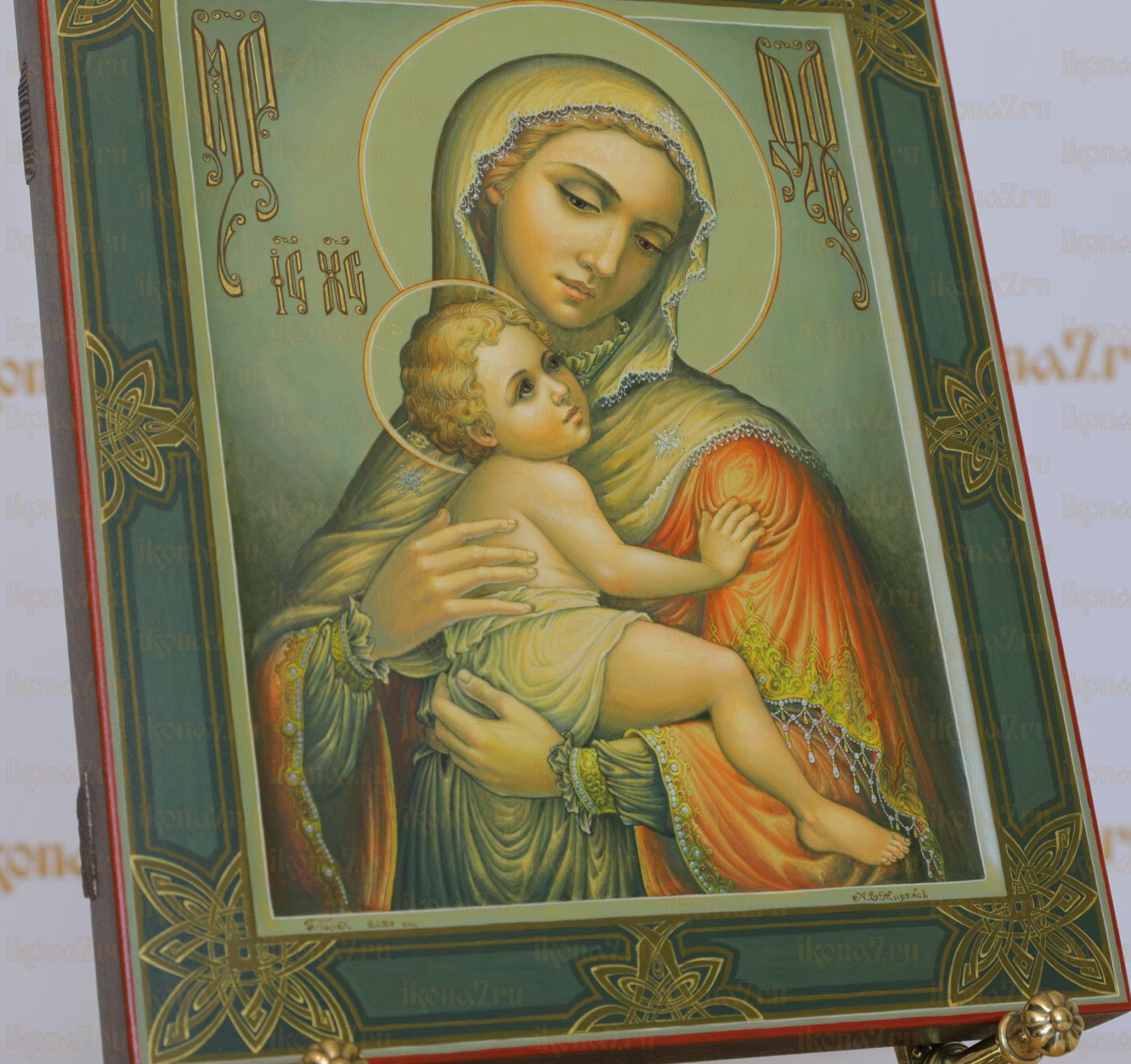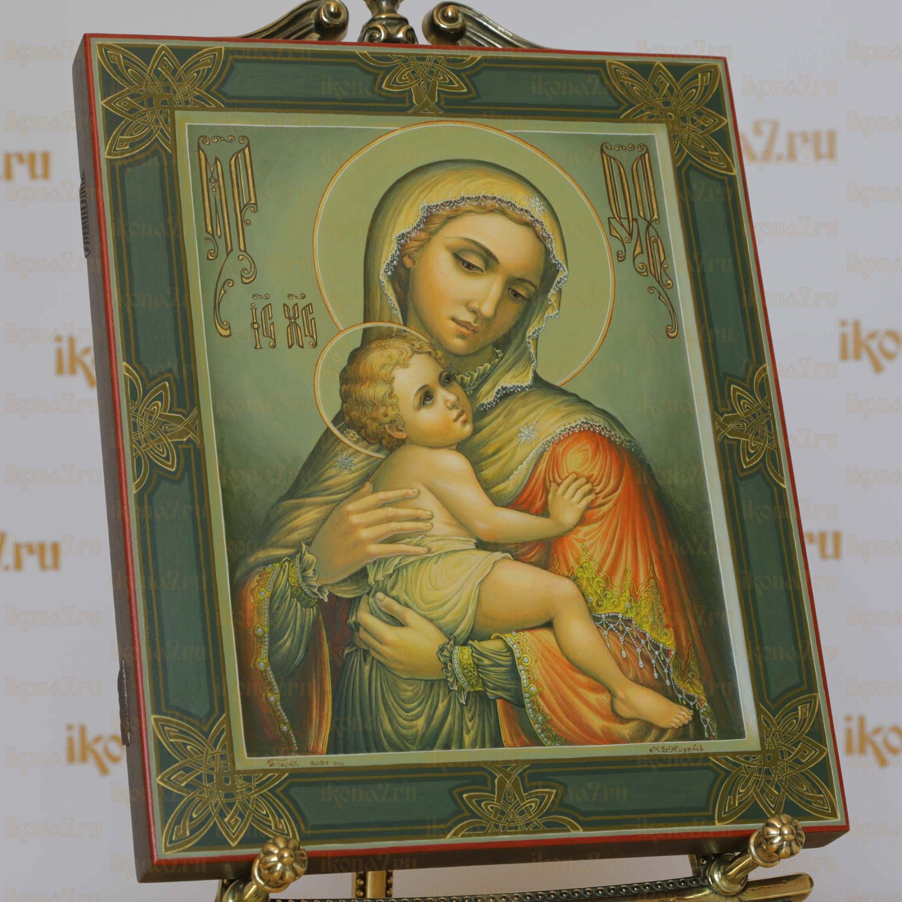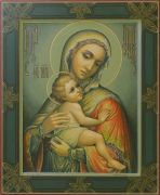 Рукописная Икона Богородицы с младенцем 27x31см (Палех авторская)