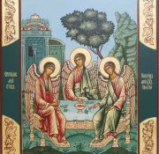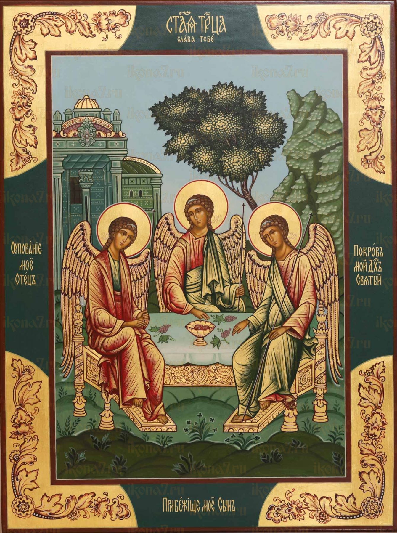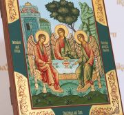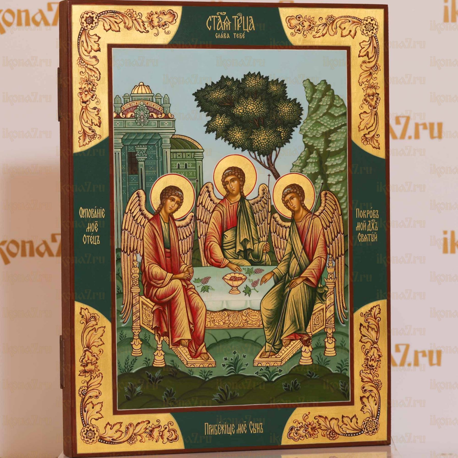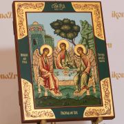 В наличии рукописная икона Троица 30х40 см с сусальным золотом