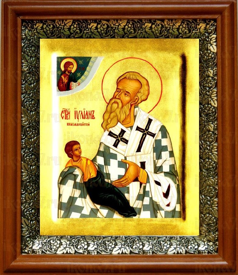 Икона Иулиан Кеноманийский в киоте с басмой Виноградная Лоза (UV-печать)(30494)