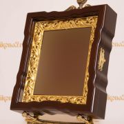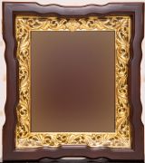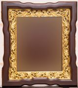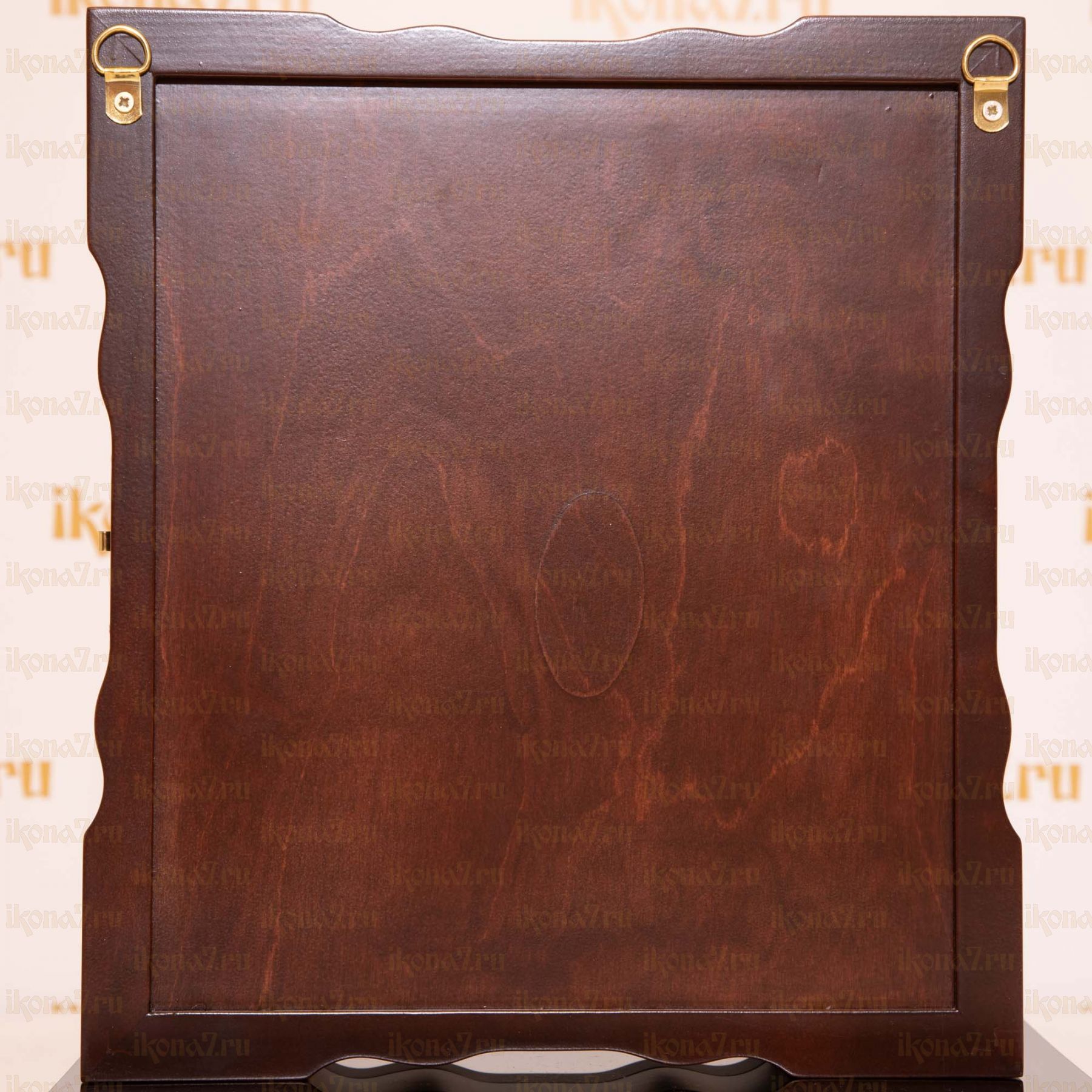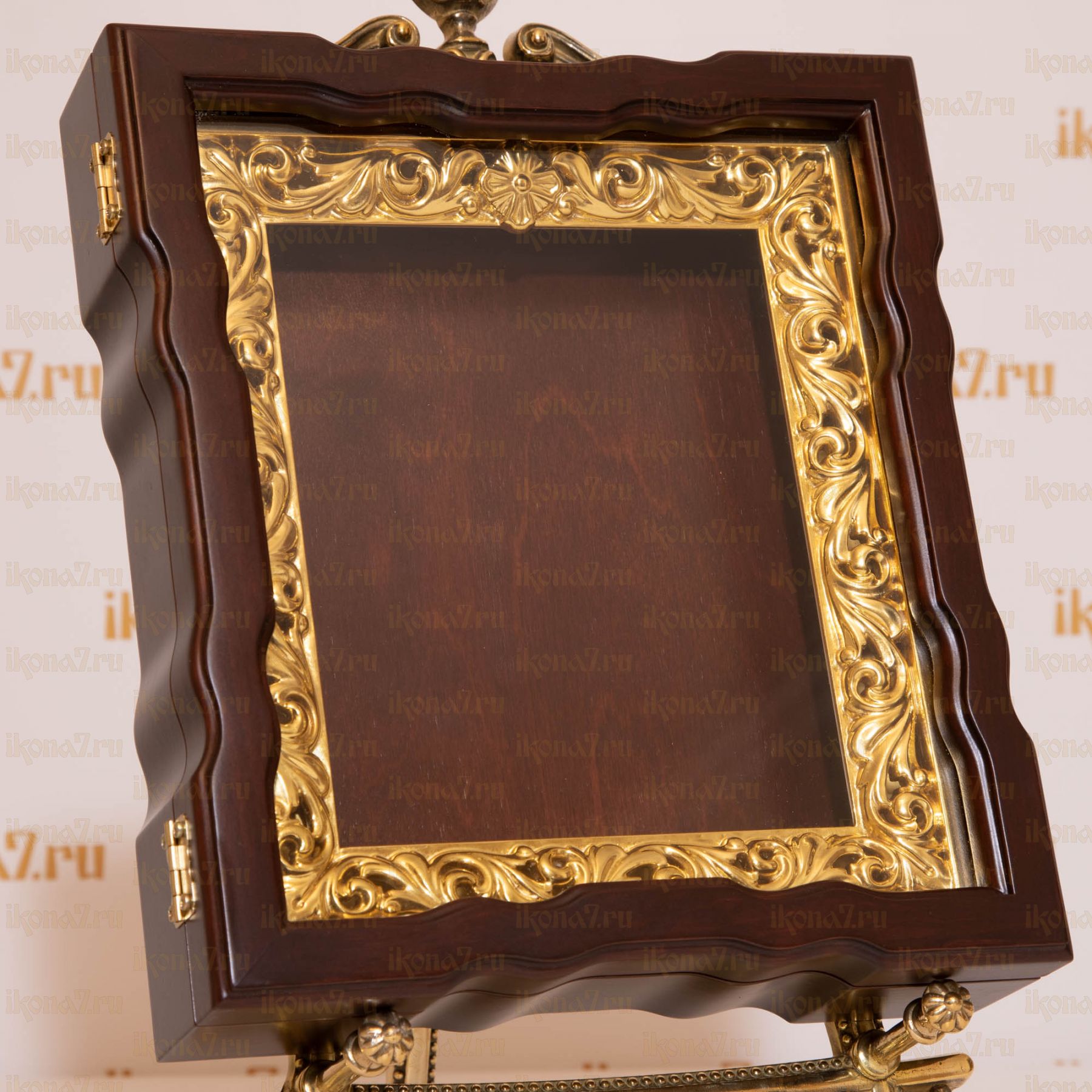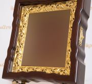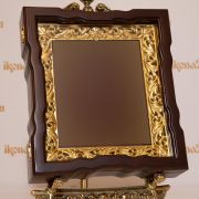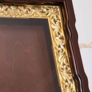 Деревянный киот ручной работы из дуба для иконы c фигурными краями. Внутренняя рамка (багет) пропильная, сделана вручную и покрыта настоящим сусальным золотом.