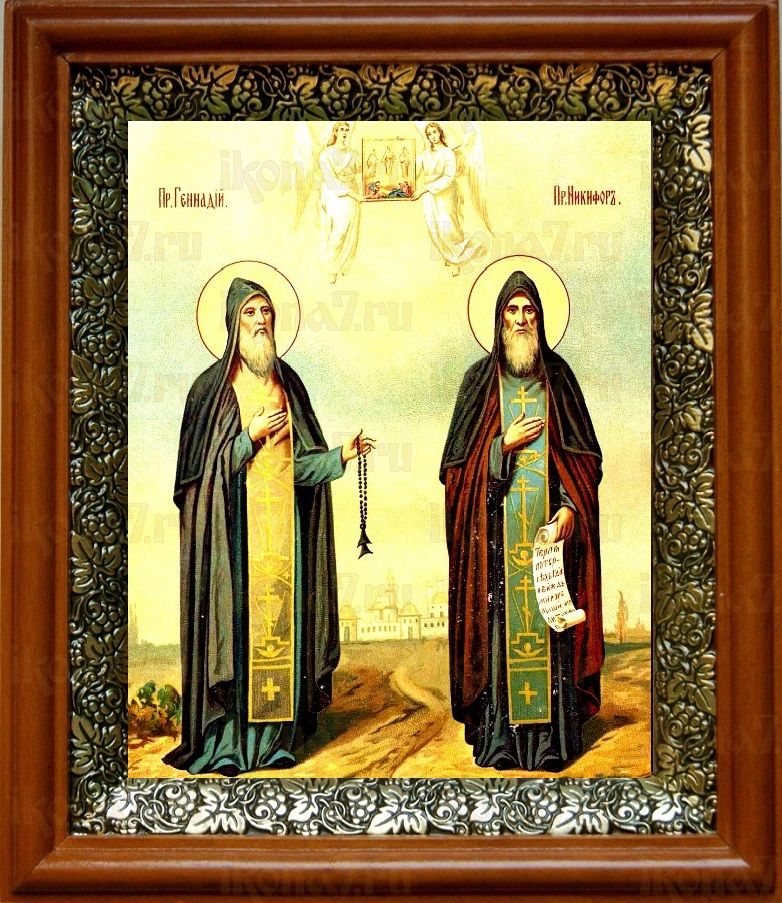 Икона Никифор и Геннадий Важеозерские в киоте с басмой Виноградная Лоза (UV-печать)(30666)