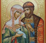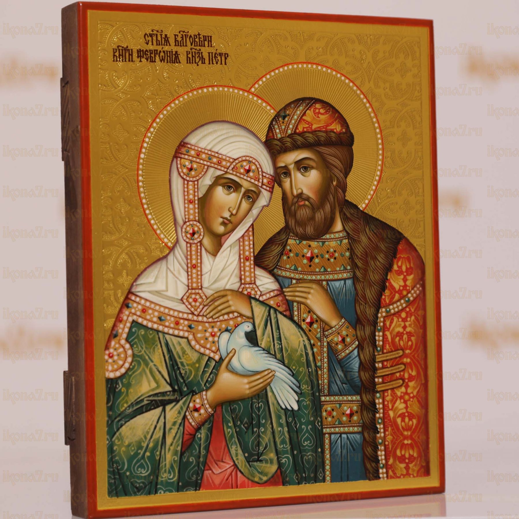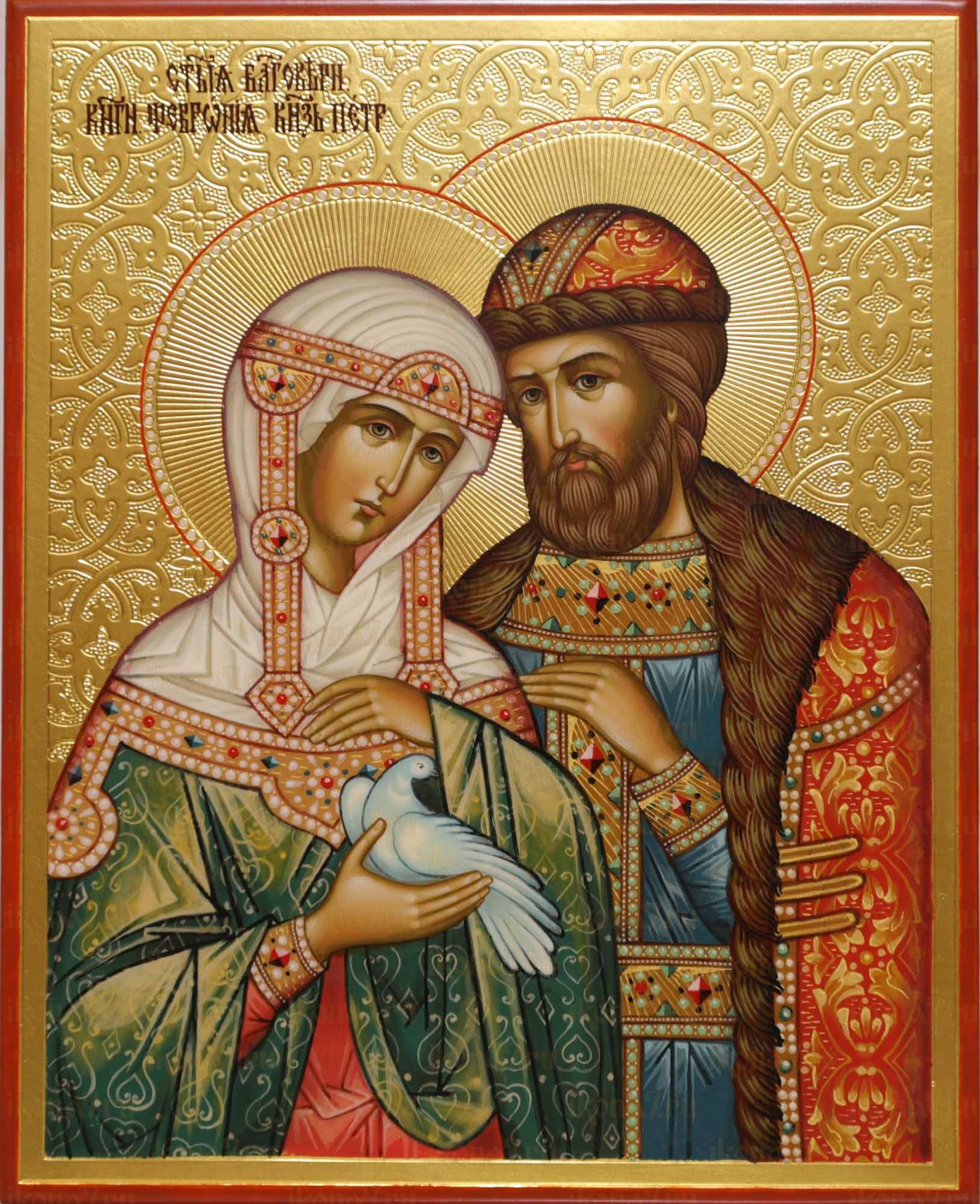 Рукописная икона Петр и Феврония Муромские 17х21см (Палех)(чеканка на сусальном золоте)