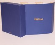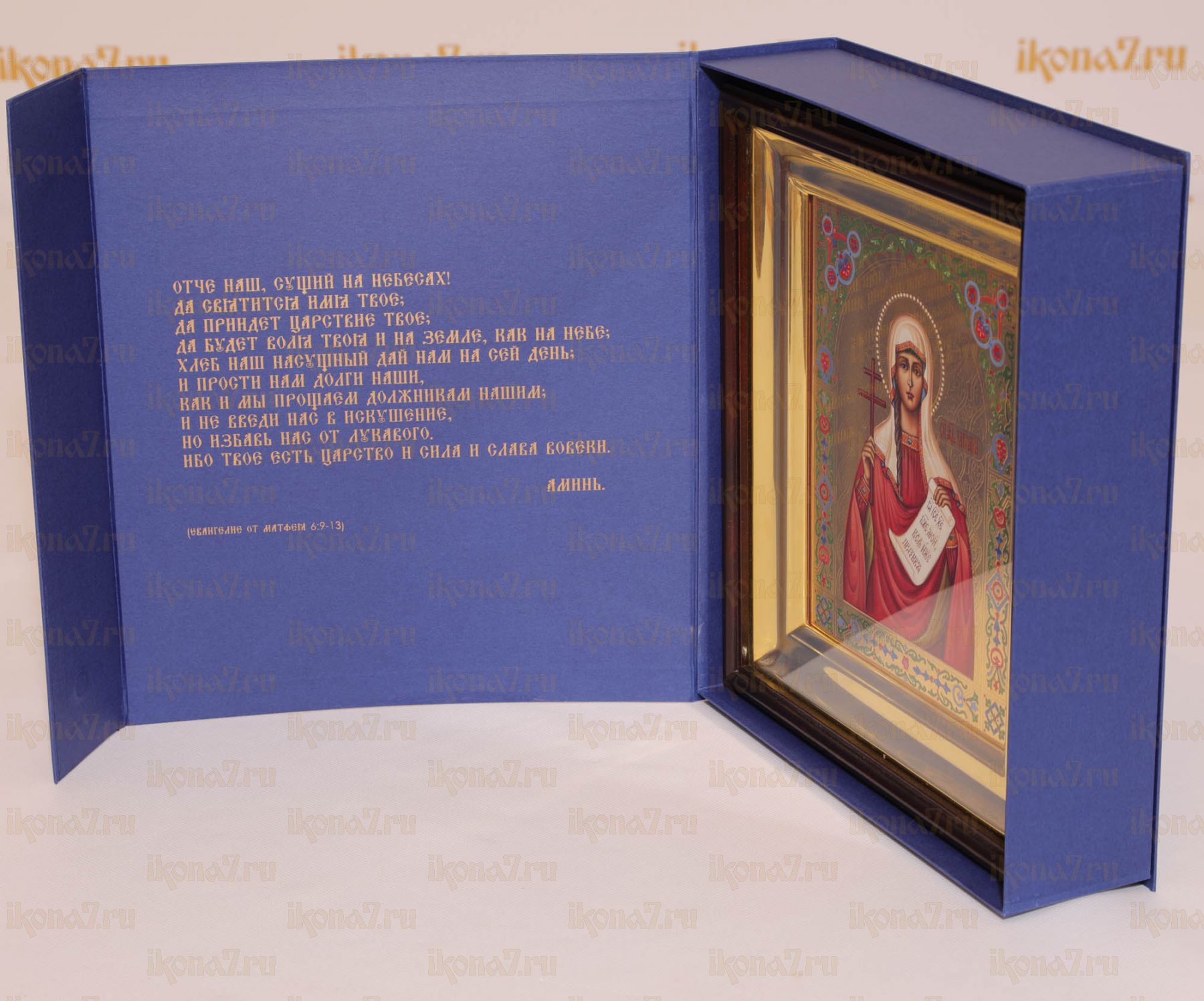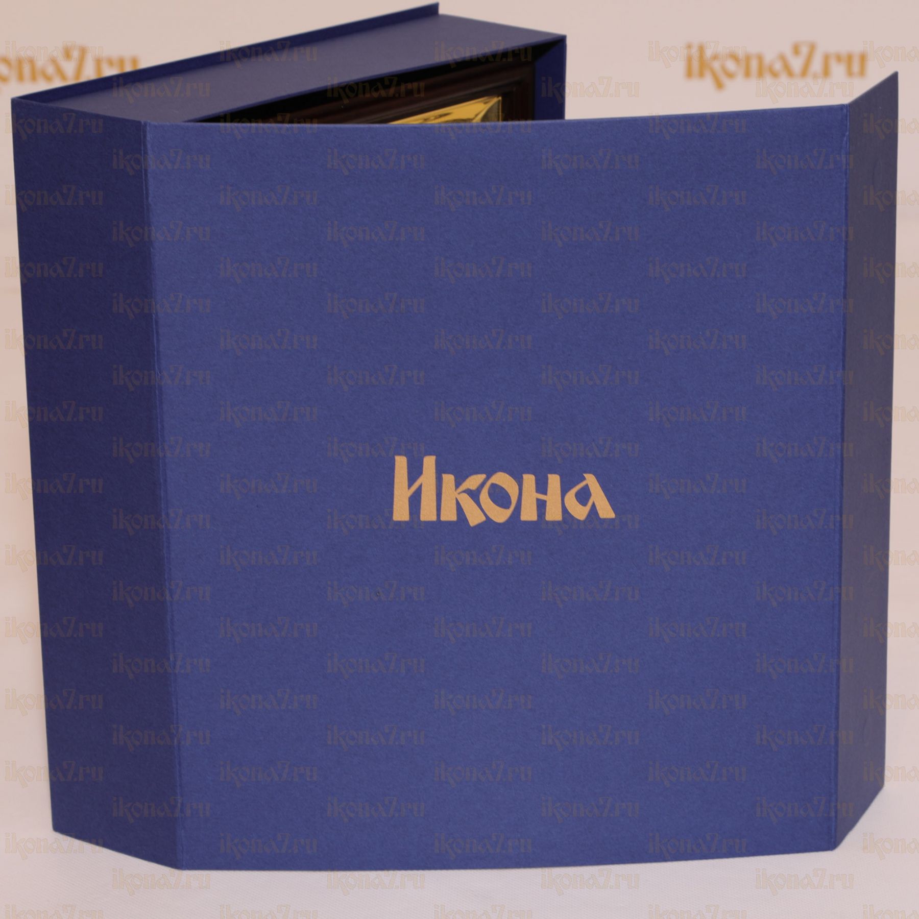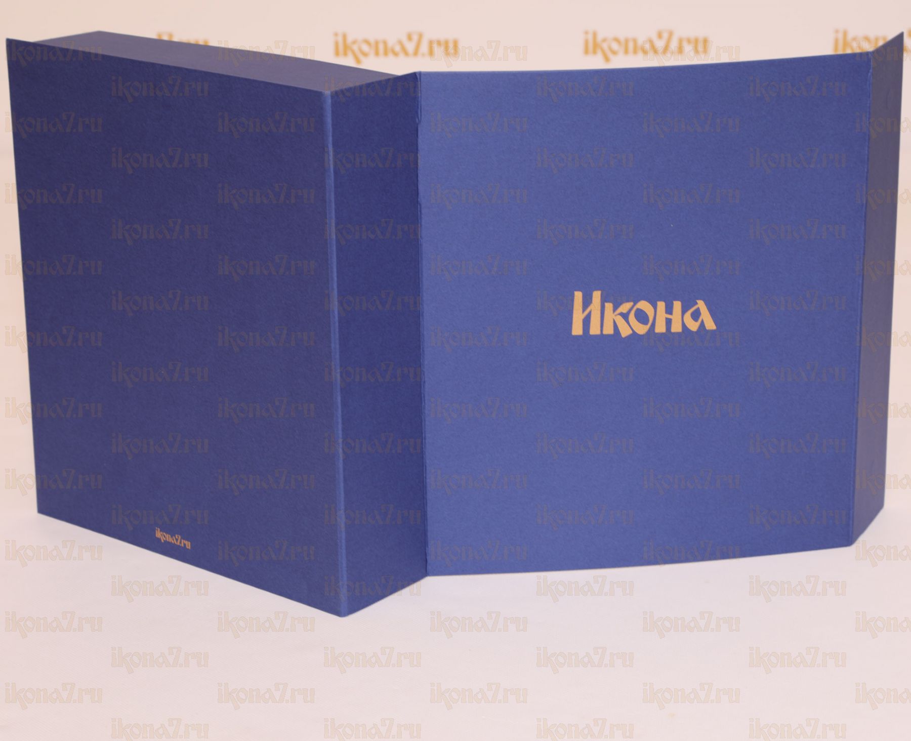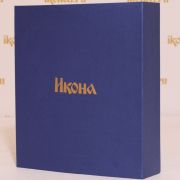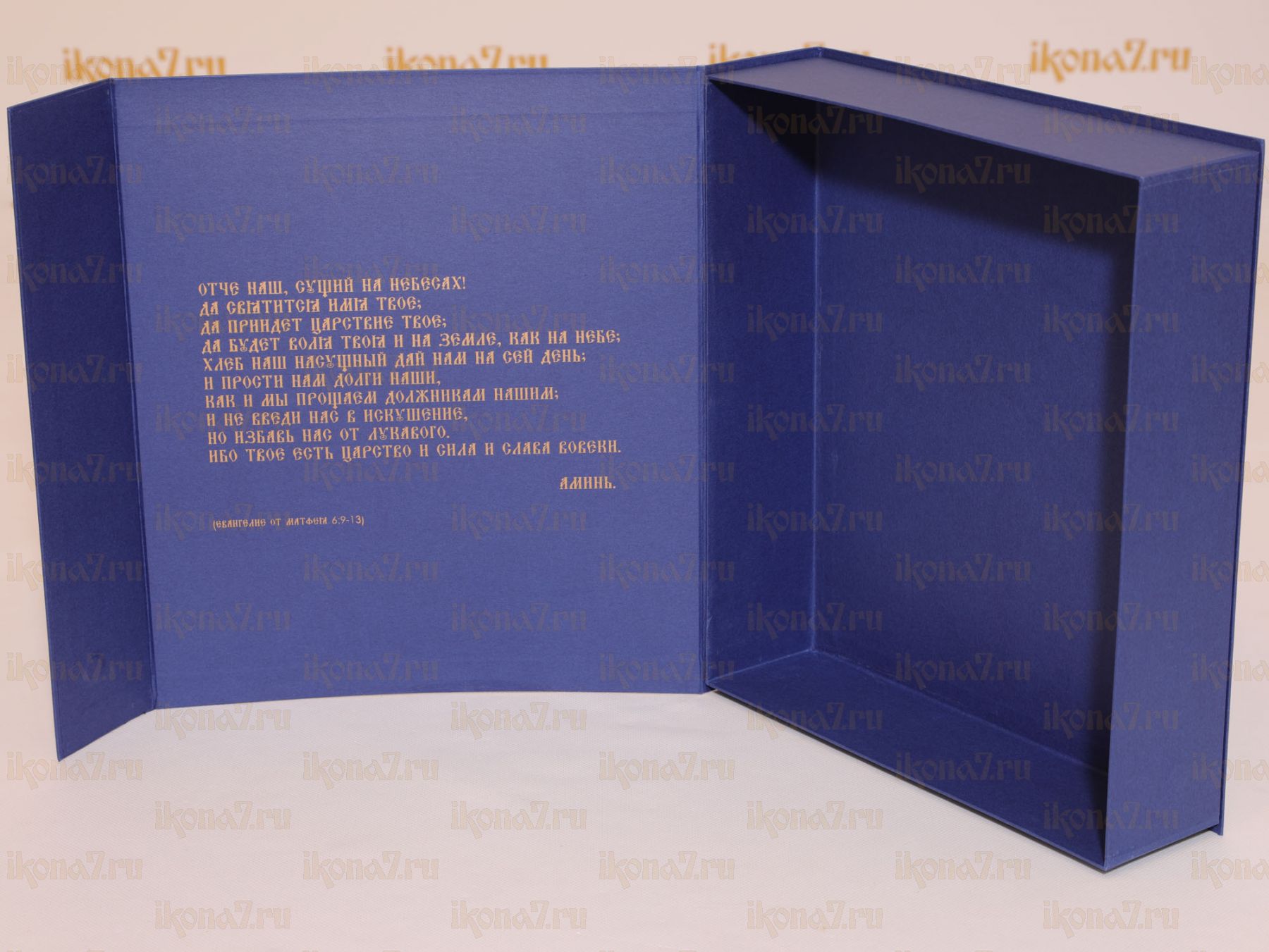 Подарочная коробка для киота иконы из плотного дизайнерского картона с надписью Икона и молитвой "Отче Наш" на внутренней части коробки, выполненные буквами с золотым тиснением. Коробка закрывается на магнитный замок.