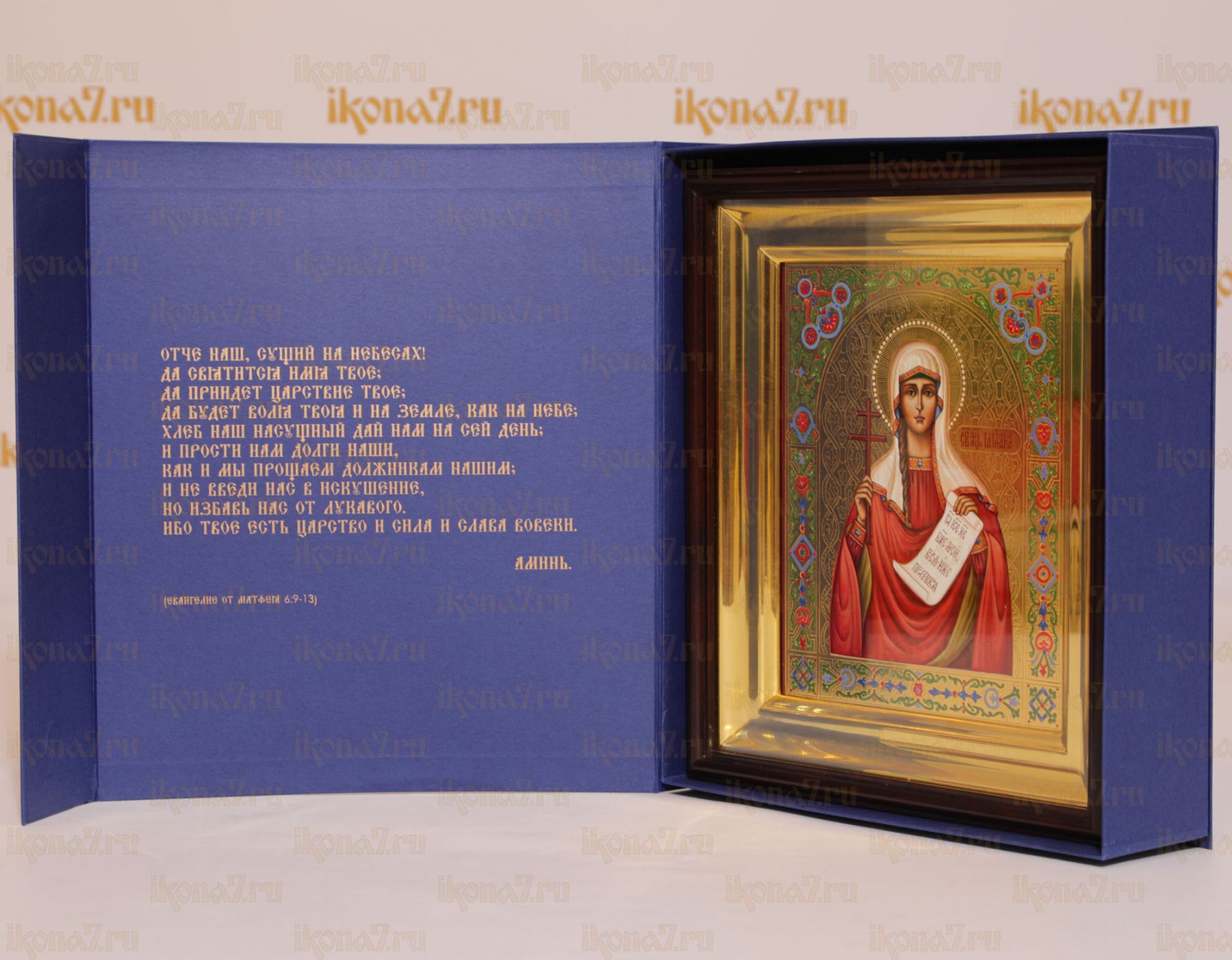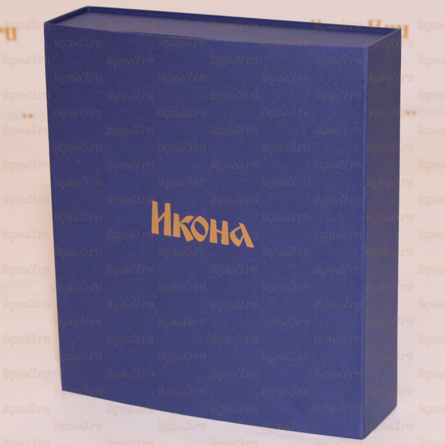 Подарочная коробка для киота иконы из плотного дизайнерского картона с надписью Икона и молитвой "Отче Наш" на внутренней части коробки, выполненные буквами с золотым тиснением. Коробка закрывается на магнитный замок.