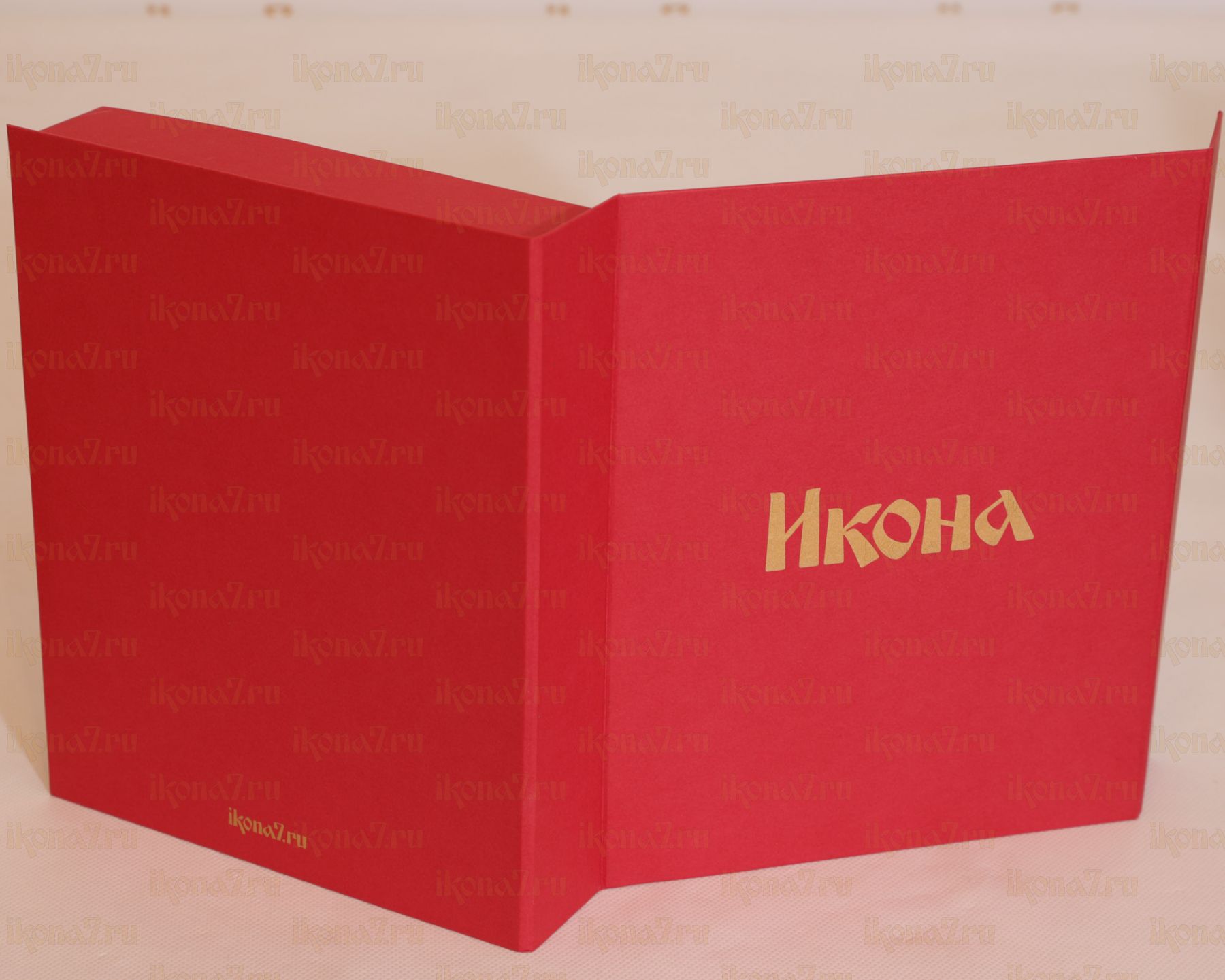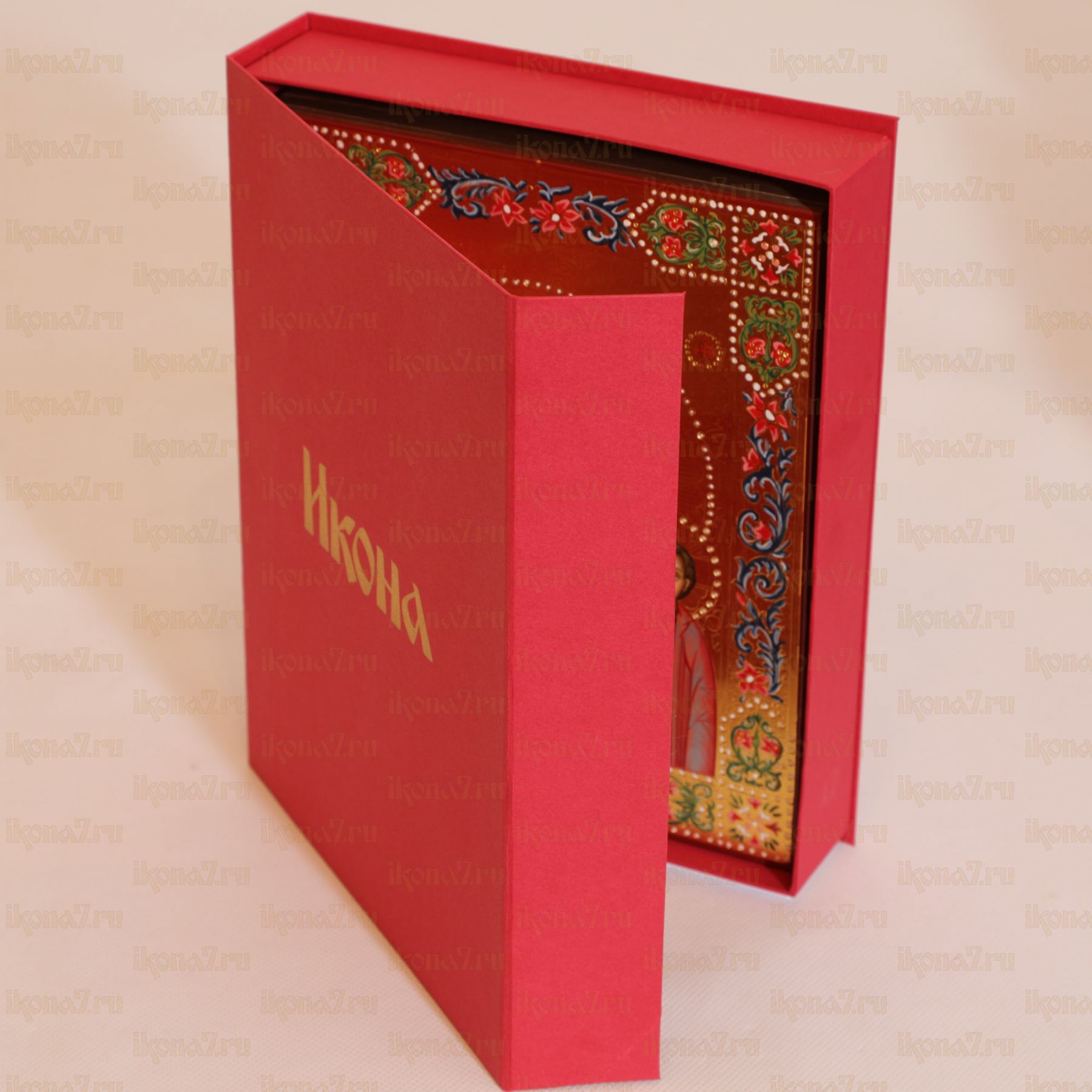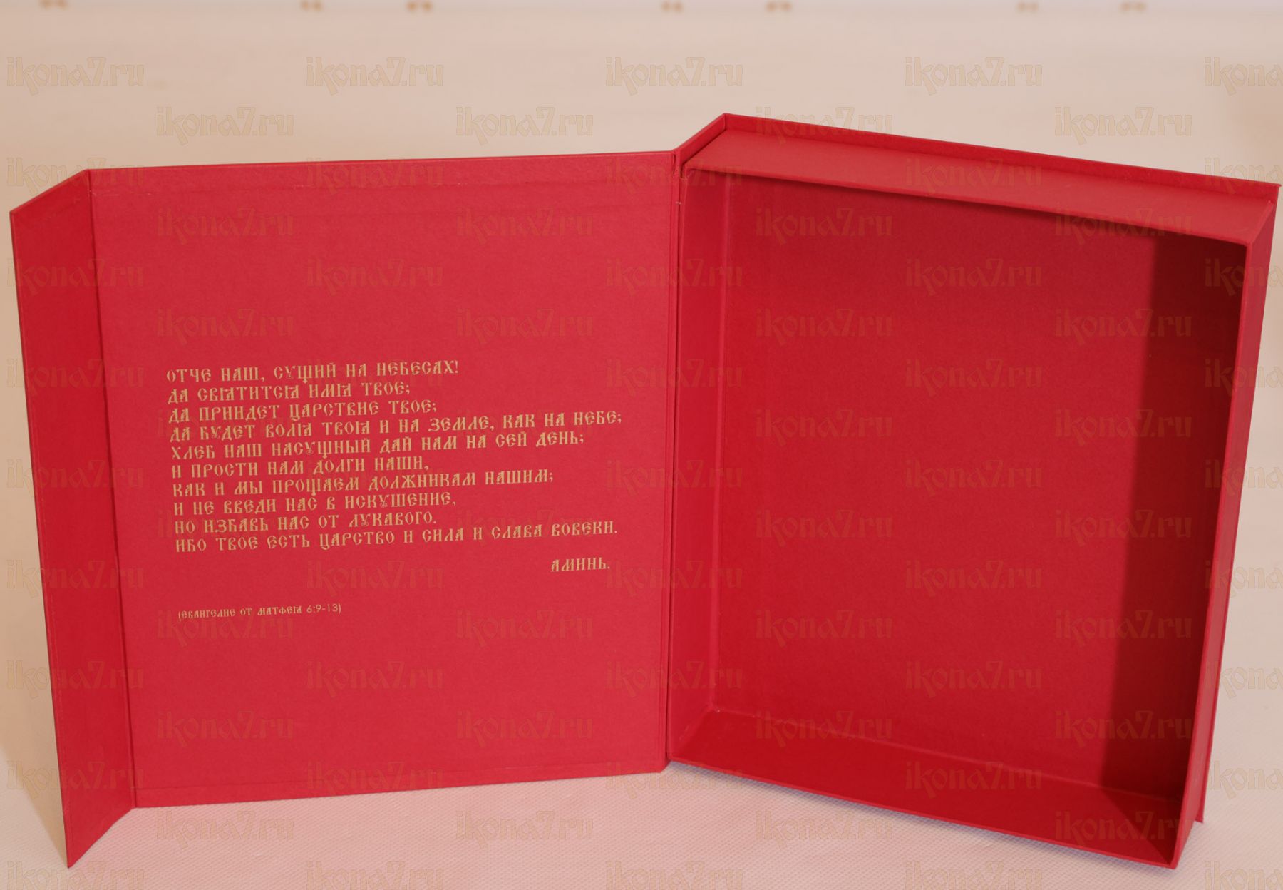 Подарочная коробка для иконы из плотного дизайнерского картона с надписью Икона и молитвой "Отче Наш" на внутренней части коробки, выполненные буквами с золотым тиснением. Коробка закрывается на магнитный замок.