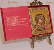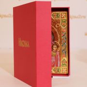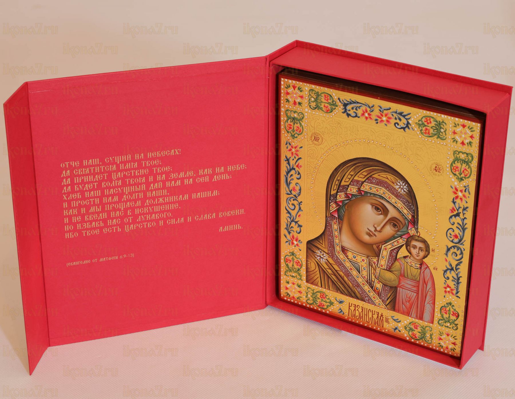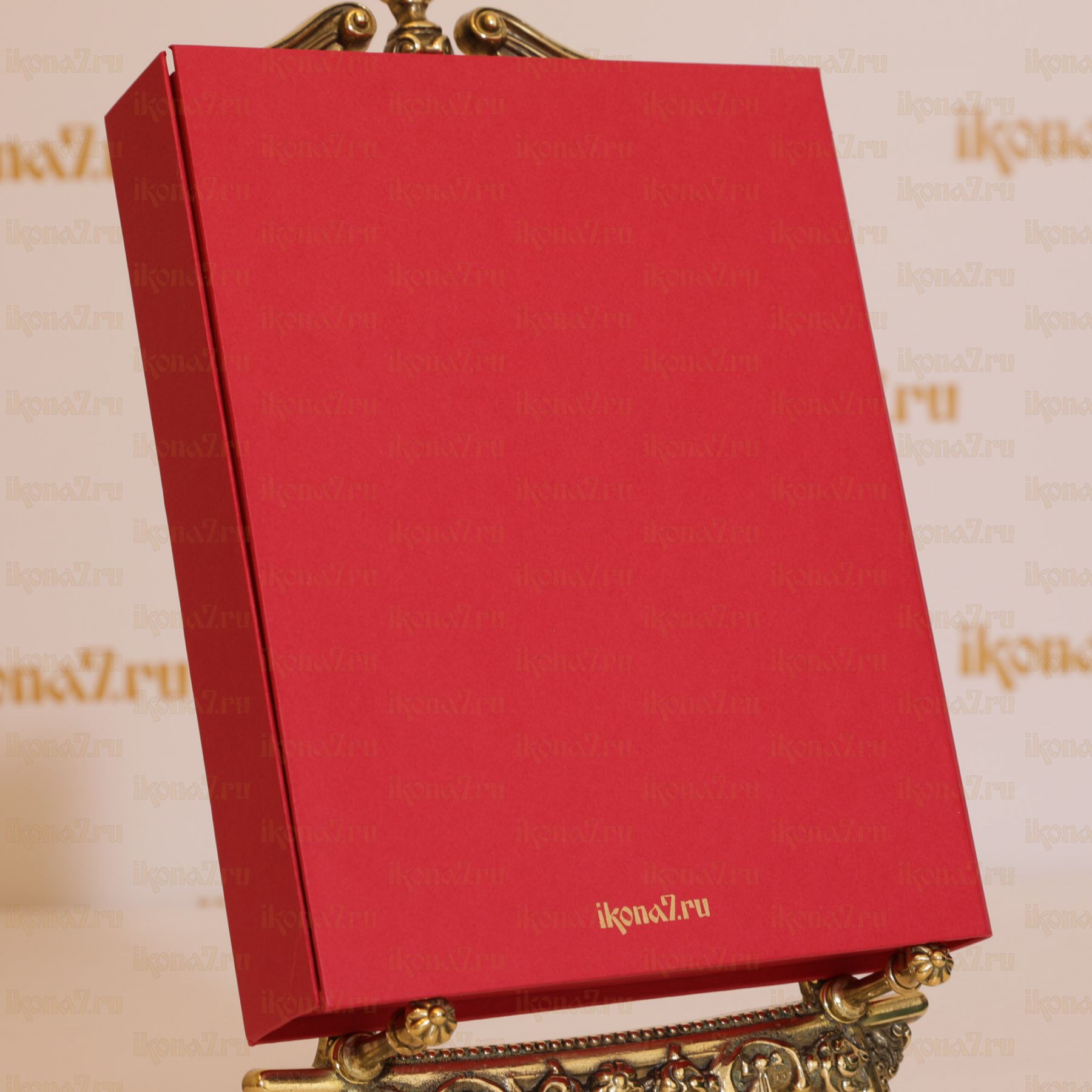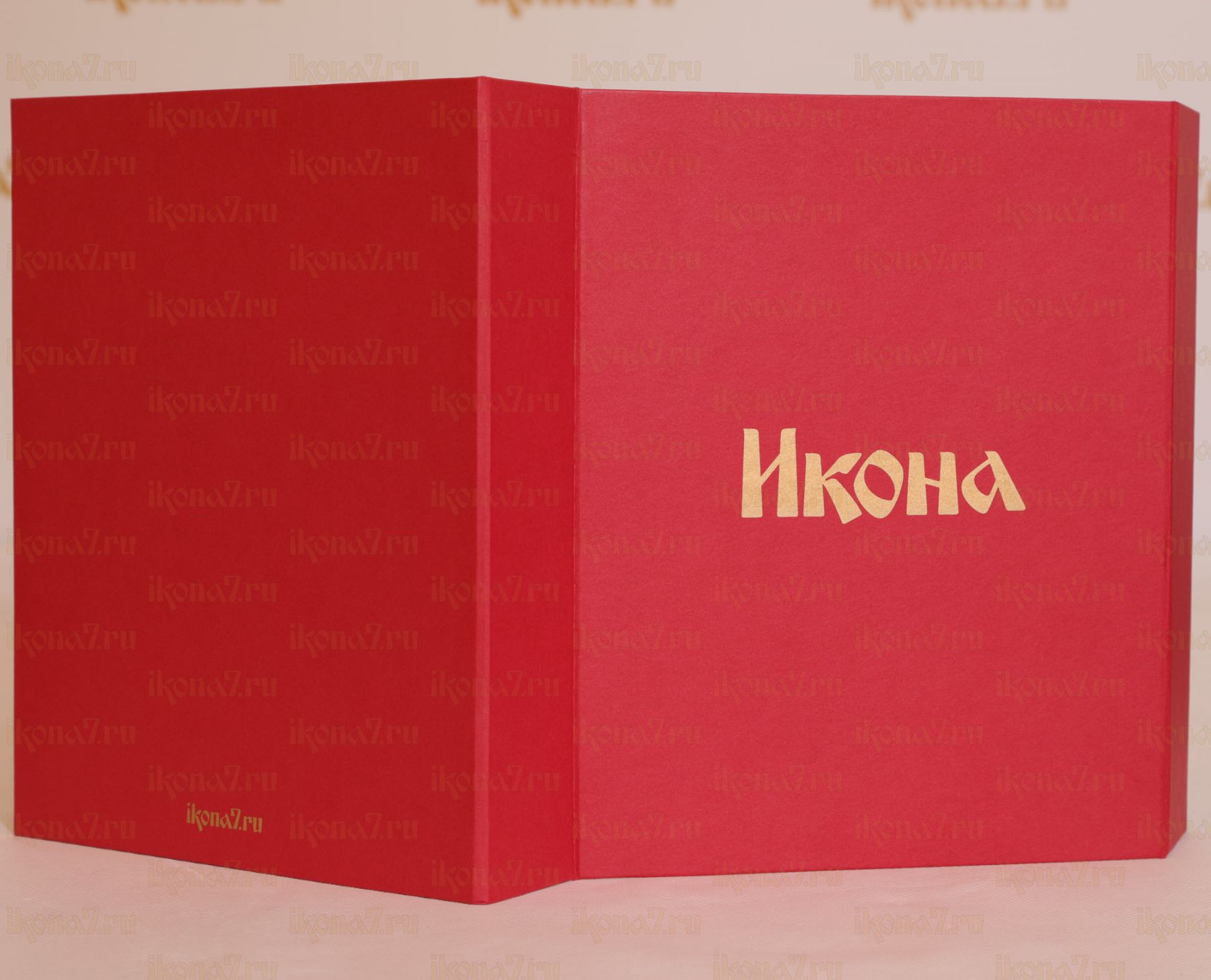Подарочная коробка для иконы из плотного дизайнерского картона с надписью Икона и молитвой "Отче Наш" на внутренней части коробки, выполненные буквами с золотым тиснением. Коробка закрывается на магнитный замок.