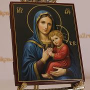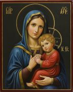 В наличии авторская работа Богородичный образ 17*21см рукописная икона (Палех) с подписью автора. Выполнена на манер западноевропейской живописи. Канонически похожа на Тихвинскую. Уровень письма - филигранное. Лак - полуматовый, схожий с олифой. Аналогичная (копия) икона представлена в Даниловском монастыре, написанная этим же автором.