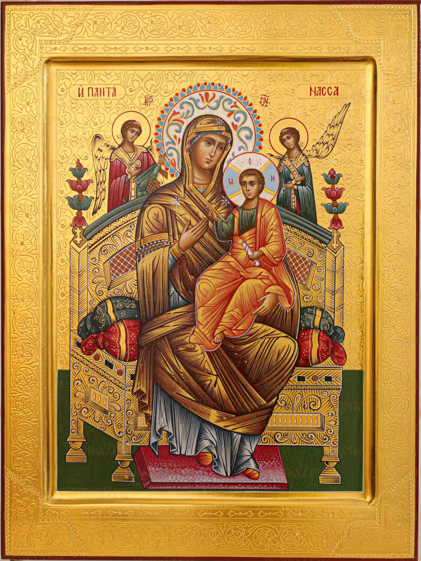 Рукописная икона Всецарица 30х40 см с чеканкой на сусальном золоте