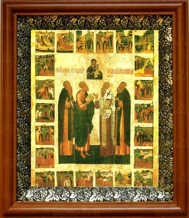 Икона Савва Крыпецкий, Евфросин Псковский, Савва Сербский и Иоанн Богослов в киоте с басмой Виноградная Лоза (UV-печать)(30816)
