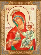 UV-печать является самой качественной и долговечной среди существующих технологий. Пигменты краски не выцветают под действием ульрафиолета, а наоборот затвердевают со временем, не теряя яркости и насыщенности. Профессиональная цифровая предпечатная обработка образов и высокое разрешение позволяют добиться максимальной схожести с рукописными иконами. Элементы иконы имитируют сусальное золото и имеет соответствующий блеск и переливы.