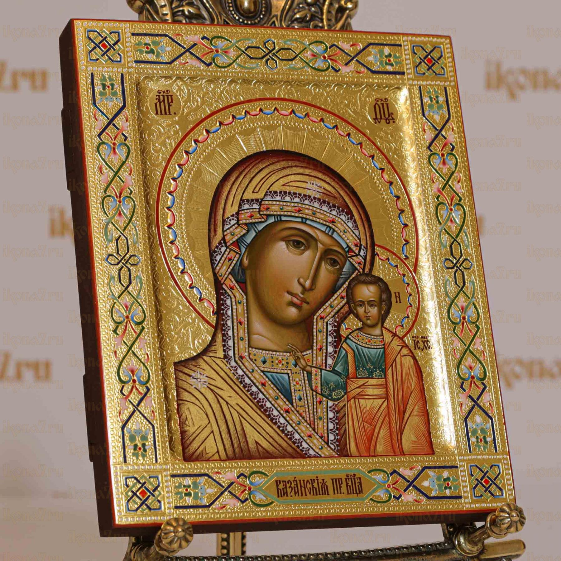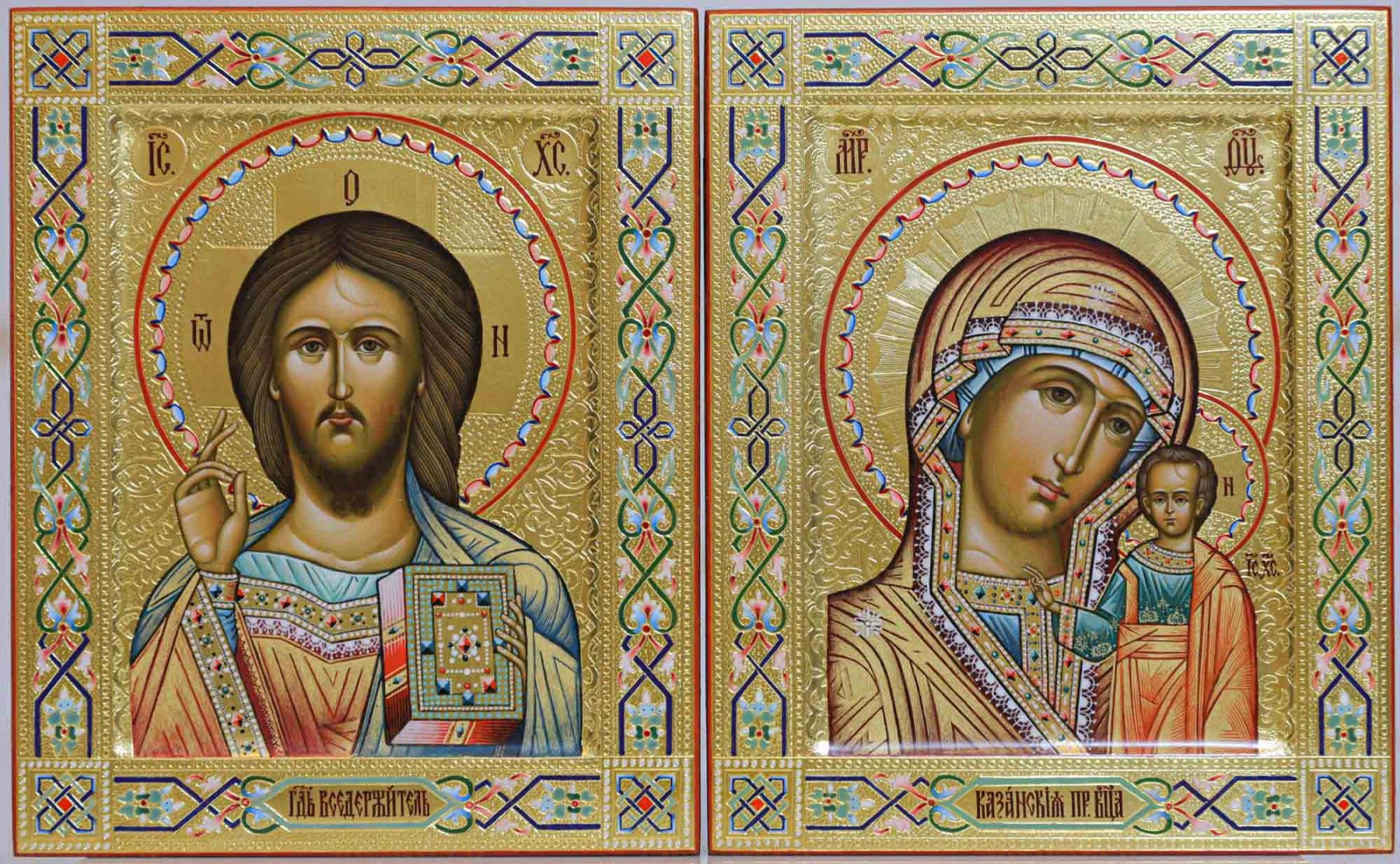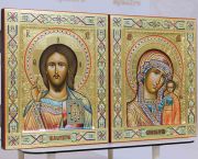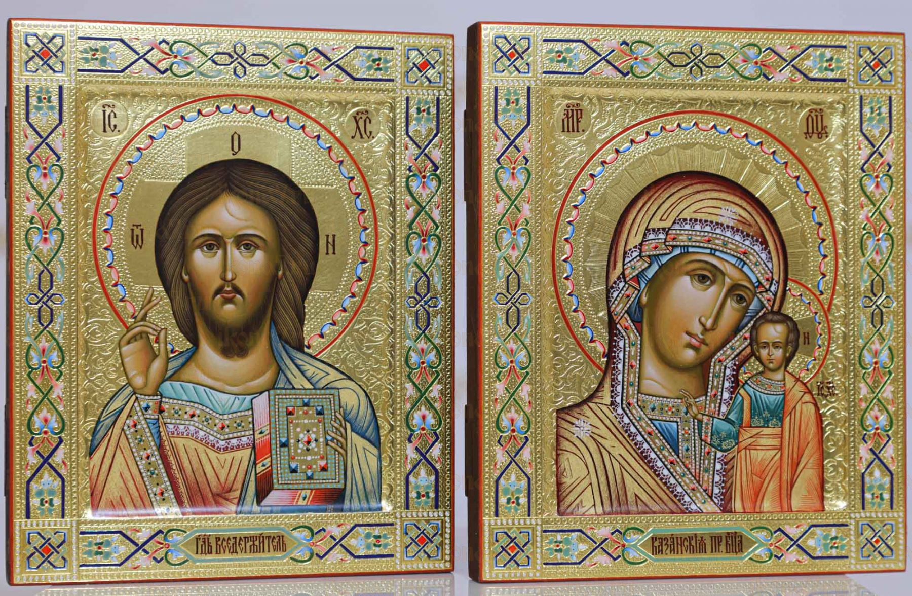 В наличии рукописные иконы Венчальная пара: образ Казанской Божией Материа  и Икона Спасителя Господь Вседержитель размером 17х21 см каждая (рукописные иконы с сусальным золотом Мanetti (Италия), ювелирными эмалями и чеканкой). Резьбой или чеканкой по дереву с сусальным золотом выполнен весь фон иконы. Иконы выполнены на доске с ковчегом - вытесанное углубление, которое несет не только декоративную функцию, но также дополнительно защищает древесину от искривления, а живопись внутри от повреждений.