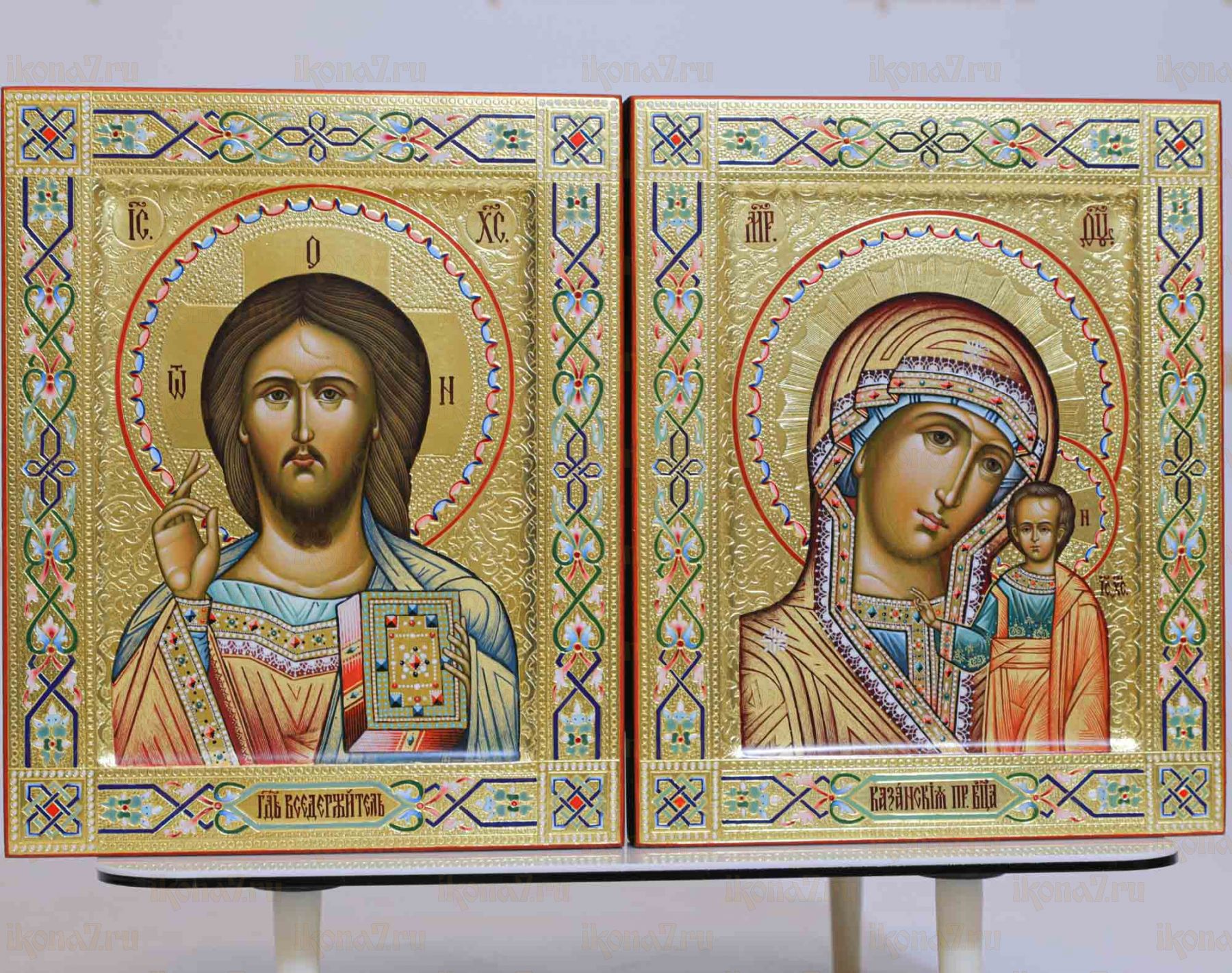 Венчальная пара: Казанская БМ и Господь Вседержитель 17х21 см (рукописные иконы с сусальным золотом, ювелирными эмалями и чеканкой)
