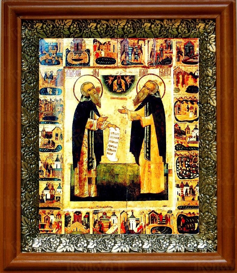 Икона Зосима и Савватий Соловецкие в киоте с басмой Виноградная Лоза (UV-печать)(30406)