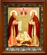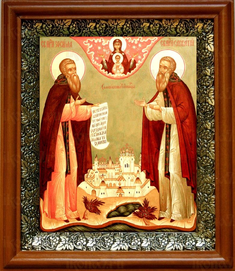 Икона Зосима и Савватий Соловецкие в киоте с басмой Виноградная Лоза (UV-печать)(30405)